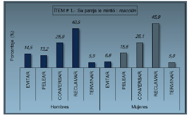 Esta reacción parece ser diferente entre hombres y mujeres. Casi la mitad de ellos reaccionan con Reclamo, lo cual lleva a delinear que la acción de Reclamar al otro es inherente a la relación y refleja la capacidad de las personas jóvenes para evidenciar los conflictos que se les presentan en esta praxis relacional, actuando en términos de exigencia de los acuerdos de franqueza implícitos en las acciones del otro y demandando la revisión de la conducta y explicaciones que faciliten la recuperación de lazos de confianza, tal como lo señalan Núñez et al. (2015). También lleva a pensar que puede asociarse, para el caso de las mujeres, Su reacción fuerte sería justificada por su tendencia a las relaciones más duraderas e íntimas (Martínez, 1997).
