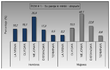 De manera similar, mujeres (19.5%) y hombres (19.1%), respondieron con la conducta de Olvidar, decidiendo no volver a recordar la situación y continuar con su relación de pareja acostumbrada. Sin embargo, el 18.2% de los hombres escogieron hacer La Misma conducta que su pareja, a diferencia del 9.3% de ellas. En cambio, aunque en un bajo porcentaje, ambos géneros de manera similar asumen la conducta de Terminar la relación (8.6% de las mujeres contra el 9.5% de los hombres).