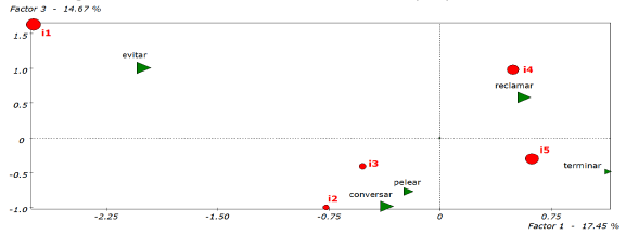 La Figura 5, que muestra el plano factorial definido por el primer y tercer eje del análisis de correspondencia de las variables intensidad y respuesta inmediata, y que es el que mejor representación presenta, explicando el 32.12% de la varianza observada. Lo anterior permite identificar que las intensidades de molestia altas (4 y 5) se asocian con Reclamar y en menor grado con Terminar, las intensidades medias (2 y 3) se asocian con Conversar y con menor grado con Pelear, en tanto que la molestia baja (1) se asocia con Evitar.