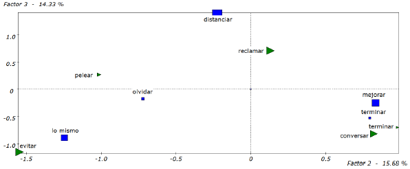 En la Figura 6, que muestra el plano factorial definido por el segundo y tercer eje del análisis de correspondencia de las variables respuesta inmediata y conducta a plazo, y que explica el 30.01% de la varianza observada, y donde mejor están representadas las diversas categorías, permite observar las siguientes asociaciones: Conversar se relaciona fundamentalmente con Mejorar; Reclamar con Distanciar; Evitar con Lo Mismo. Pelear y Terminar, no están bien representadas.