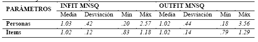 Aunque las desviaciones fueron bastante superiores a las obtenidas con los ítems, los valores medios fueron muy cercanos a los valores esperados de ambos estadísticos que son 1.0, lo que permitió afirmar el buen ajuste global por parte de las personas.