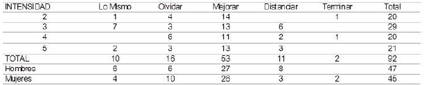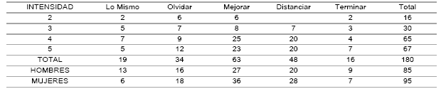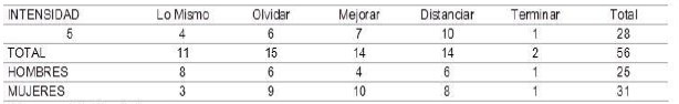 Respecto a la conducta inmediata Pelear (Tabla 4). De acuerdo con la Tabla 4, la reacción de Pelear se da con alto nivel de intensidad entre los estudiantes, indicando que cuando se Pelea es porque la molestia fue alta. Los resultados de la Tabla 4, muestran que la actitud Pelear puede traer como consecuencia una Mejora de la relación o el Olvido de la situación (las dos juntas representan el 52% de los casos), o, en el peor de los casos, un Distanciamiento entre los miembros de la pareja (la cuarta parte de los casos). Aquí, el comportamiento de hombres y mujeres fue muy similar.