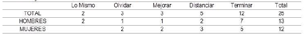 Respecto a la conducta inmediata Terminar (Tabla 6). La opción de Terminar por la mentira de su pareja solo fue optada por 25 de los estudiantes entrevistados: 6% del total de casos. De estos, la gran mayoría, prácticamente la mitad de ellos, Terminaron su relación. En menor grado se Distanciaron, Olvidaron, Mejoraron y continuaron Lo Mismo.