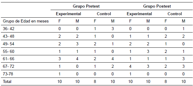 La muestra inicial estuvo conformada por 40 niños (as) con edades comprendidas entre 36-78 meses, pertenecientes a una institución educativa del área rural de un municipio del departamento de Boyacá para la asignación aleatoria se utilizó el programa STATS ® en su versión 2.0; los grupos quedaron conformados de la siguiente manera: 20 niños (as) en el grupo control y 20 niños (as) en el grupo experimental; sin embargo, dos niñas del grupo control se trasladaron a otra ciudad y no fue posible realizar la valoración a nivel postratamiento; por lo tanto, la muestra final estuvo conformada por 38 menores, para un total de 18 participantes en el grupo control, de los cuales 8 fueron niñas y 10 niños, que equivalen a un 48 % de la muestra total, y 20 participantes en el grupo experimental, de los cuales 10 eran niños (50 %) y 10 fueron niñas (50 %), para un total equivalente al 52 % de la muestra total (tabla 1).
