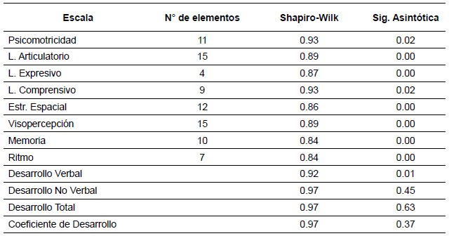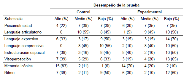 Se realizó un análisis por frecuencias en cada una de las subescalas con los datos de la prueba española original para hacer una aproximación al desempeño de los niños, tomando como valores de referencia los centiles reportados en la prueba original, descritos como desempeño bajo a los niños que se encuentran en el centil 5 a 39, medio entre el centil 40 y 60 y alto entre el centil 61 y 99. Se encontró que 40 % de los niños del grupo control obtiene puntuaciones bajas, el 28 % medias y el 32 % altas; en contraste con el grupo experimental el 49 % obtiene puntuaciones bajas, el 24 % medias y el 27 % altas. Se encontró que en el grupo control, 8 niños (44 %) presentaron una puntuación por debajo de 90 en el coeficiente de desarrollo, y 10 (64 %) presentan un desarrollo promedio para su edad. En el grupo experimental 12 niños (60 %) presentan una puntuación inferior a 90 puntos en el coeficiente de desarrollo, 6 (30 %) presentaron un desarrollo promedio, y 2 (10%) presentan un desarrollo promedio alto.