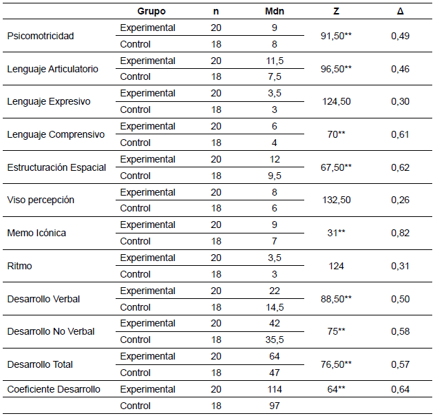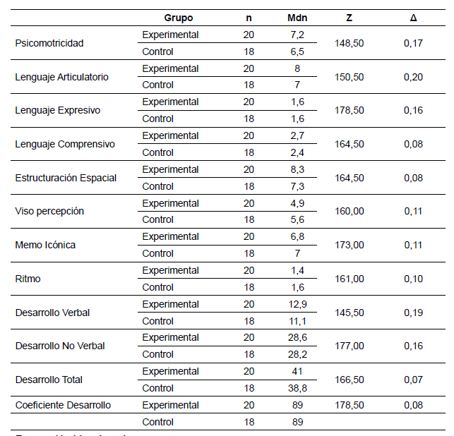 A nivel postratamiento se encontraron diferencias estadísticamente significativas en las sub escalas de psicomotricidad, lenguaje articulatorio, lenguaje comprensivo, estructuración espacial y memoria icónica; a nivel descriptivo se observó un desempeño superior en el grupo experimental respecto al grupo control; en cuanto al valor de ME Delta de Cliff en cada subescala es elevado, de igual manera que en las escalas agrupadas; no se hallaron diferencias en las subescalas de lenguaje expresivo, visopercep-ción y ritmo. Los dos grupos no presentaron signos de inmadurez neuropsicológica, ya que presentaron puntuaciones mayores a 90 puntos en el coeficiente de desarrollo.