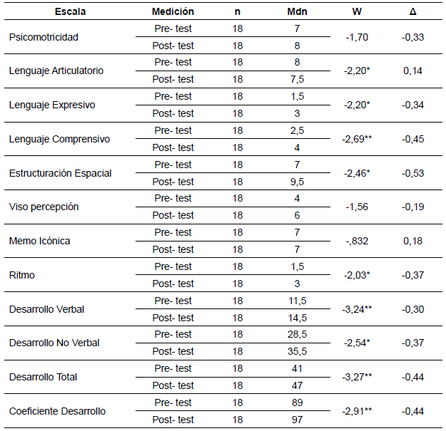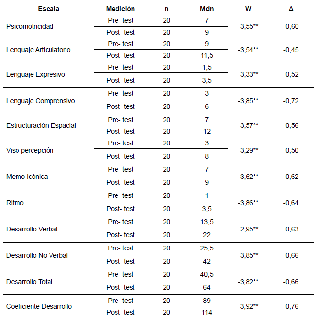 Se encontraron diferencias significativas en todas las subescalas evaluadas, exceptuando las escalas de psicomotricidad, visopercepción y memoria icónica. La subescala de lenguaje articulatorio presentó un menor desempeño a nivel postratamiento. Los valores Cliff Delta ponen de manifiesto un cambio leve y moderado.
