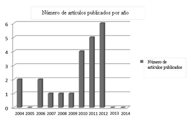 La primera variable analizada fue la cantidad de artículos publicados por año. Por medio de la figura 1 se puede ver que no fueron encontrados estudios sobre el tema en 2005, 2013 y 2014. No es posible afirmar que hubo un crecimiento de estudios a lo largo de los 10 años analizados, ya que 2013 y 2014 no presentaron ninguna publicación, y se constata que las mayores frecuencias de publicaciones se produjeron en 2010 a 2012, totalizando 15 artículos.