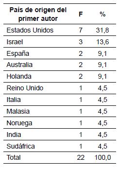 Las informaciones sobre publicaciones por país de origen del primer autor están dispuestas en la tabla 1. Estados Unidos, Israel, España, Australia y Holanda fueron los países, en orden decreciente, que más publicaron sobre el asunto.