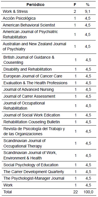 Hubo gran variedad de revistas y ninguna de ellas presentó predominio de publicaciones en el tema en relación a las otras. Solo la revista Work & Stress presentó dos publicaciones en el período analizado y las otras 20 revistas publicaron un artículo cada una.