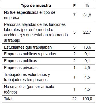 En relación con el tipo de muestra se percibe que las mayores frecuencias eran de trabajadores, sin especificación del tipo de organización en que ellos ejecutaban sus funciones laborales (Cinamon, 2006; Federici & Skaalvik, 2011; Hennessy & Lent, 2008; King, 2009; Salanova et al., 2011; Strauser et al., 2010; Waghorn, Chant & King, 2007), seguido de estudios que contaron con muestras de personas que estaban retornando al trabajo después de ser alejados por problemas de enfermedad o accidentes de trabajo (Bains et al., 2012; Brouwer et al., 2011; Lagervelda, Blonka, Brenninkmeijerb & Schaufelib, 2010; Shaw, Reme, Linton & Prans-ky, 2011; Soeker, 2012). En menor frecuencia se encontraron estudios que investigaron estudiantes que trabajaban (Cinamon, 2010; Pepe, Farnese, Avalone, & Vecchione, 2010; Riggio & Desrochers, 2006), trabajadores de empresas públicas (O'Sullivan et al., 2012; Vax, Schreuer & Sachs, 2012), provenientes de empresas públicas y privadas (Chaudhary, Rangnekar & Barua, 2012; Gismero-González et al., 2012), trabajadores de empresas privadas (Panatika, O'Driscollb & Anderson, 2011), así como muestra de trabajadores voluntarios y temporarios (Ferrari, 2004).