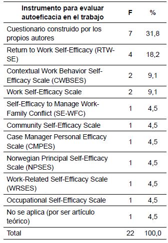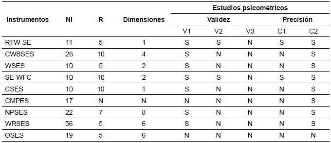 Sobre los instrumentos utilizados, en siete estudios los autores construyeron ítems para la evaluación de la temática, pero sin citar el nombre de los mismos. Del resto, en cuatro estudios el instrumento utilizado fue el RTW-SE, seguido por el CWBSES (n=2) y el SE-WFC (n=2). N las tabla 5 se presentan de forma más detallada las informaciones de esos instrumentos; tabla construida con base en las informaciones de los artículos analizados.