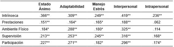 En primer lugar, se aporta una matriz de correlaciones para analizar la relación de cada dimensión de Inteligencia Emocional (IE) con cada dimensión de Satisfacción Laboral (SL), ya que las relaciones de las dimensiones de cada variable entre sí se presuponen en general altas, tal y como aparece recogido en los instrumentos originales. De esta forma, las dimensiones de IE que más relacionadas parecen estar con las de SL son Estado de Ánimo (.366 con Intrínseca), Adaptabilidad (.309 con Intrínseca) y, sobre todo, Interpersonal (.419 con Intrínseca, .325 con Ambiente Físico, .316 con Supervisión), ya que todas ellas presentan correlaciones superiores a .3 al nivel de confianza del 99%. Se confirma así la relación entre ambas variables dependientes, si bien de forma moderada (véase tabla 1).
