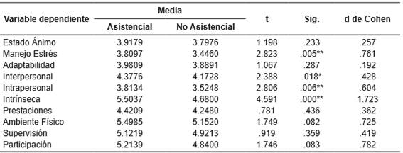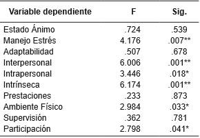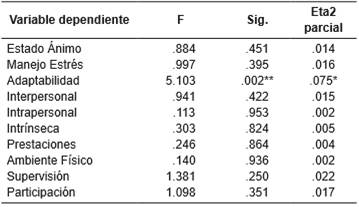 En cambio, sí que hay relación entre las variables, de modo que meediante la Traza de Pillai se confirma que los contrastes multivariados sí son significativos: F(30.543)=2.514; p=.000. De esta forma, las pruebas de los efectos intersujetos nos indican que las diferencias en ámbito profesional existen para las dimensiones Manejo de Estrés, Interpersonal, Intrapersonal, Intrínseca, Ambiente Físico y Participación, tal y como se muestra en la tabla 3. La potencia se muestra muy baja para cada dimensión.