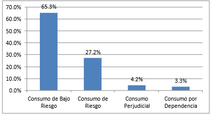 Teniendo en cuenta lo anterior, la clasificación de los patrones de consumo propuesta en el Test de Identificación de Trastornos debido al Consumo de Alcohol (AUDIT, por sus siglas en ingles), desarrollado para identificar en cuál de los patrones de consumo de alcohol se encuentra un individuo, se identifica a continuación: (a) Consumo de bajo riesgo, refiere a un consumo moderado en el que el sujeto no ha presentado ningún síntoma de gravedad; (b) el consumo de riesgo, puede presentar consecuencias adversas tanto para el bebedor como para los demás; en este el individuo aún no ha presentado ningún trastorno; (c) el consumo perjudicial, indica que el consumo de alcohol de la persona está causando un daño para la salud, tanto mental como física; de igual forma, conlleva consecuencias sociales; (d) el consumo por dependencia del alcohol, en el que están involucrados fenómenos conductuales, cognitivos y fisiológicos, los cuales aparecen después de un consumo de alcohol repetitivo (Babor, Higgins, Saunders y Monteiro, 1992; Moya et al., 2007).