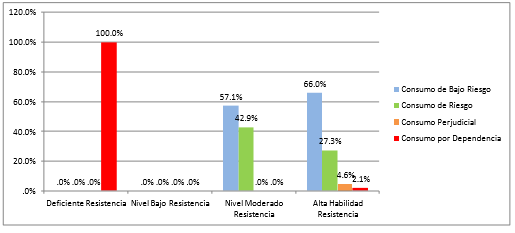 La figura 2 muestra el nivel de presión de grupo directa en función de los patrones de consumo de alcohol; se evidencia que el 66 % de los adolescentes que tienen una alta habilidad de resistencia a la presión de grupo directa presentan un patrón de consumo de bajo riesgo; este porcentaje disminuye a 57.1 % cuando los adolescentes tienen un nivel moderado de resistencia a la presión de grupo. Finalmente, a un nivel inferior de resistencia, el consumo bajo desaparece, es decir que tiende a aumentar el patrón de consumo riesgoso; sin embargo, al realizar la prueba chi-cuadrado no se presentó una relación significativa entre estas dos variables evaluadas (χ2=3.68, gl=6, p=0.719).