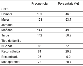 La población de estudio a la que se accedió fueron adolescentes escolarizados. El muestreo utilizado fue probabilístico estratificado en cuanto a los grados escolares. Los tamaños de muestra se calcularon de acuerdo con el parámetro tipo proporción (50 %) que maximiza el tamaño de la muestra, con un error máximo relativo no superior al 5 % y un nivel de confianza del 95 %. Puesto que se estimó una tasa de no respuesta para estudiantes del 10 %, se seleccionaron 312 estudiantes para lograr un total de 286 participantes que cumplieron los criterios de inclusión; de ellos el 53.7 % fueron mujeres, resultando así una muestra homogénea en cuanto al sexo. El rango de edad de los adolescentes estuvo entre 12 y 18 años, con un promedio de 15.3 años y una desviación típica de 1.79 años. El 25.2% de los participantes estaban cursando sexto grado, el 42.7 % el noveno grado y el 32.2 % undécimo grado de bachillerato; de estos, el 49.8 % asistía a la jornada de la mañana y el 50.2 % a la jornada de la tarde.