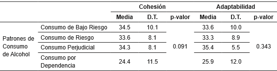 La tabla 4 muestra los patrones de consumo de alcohol en función del puntaje arrojado por las subescalas del cuestionario de evaluación de la adaptabilidad y cohesión familiar FACES. Se encontró que al nivel de significación del 5 % no existe evidencia suficiente para determinar diferencias estadísticamente significativas en la cohesión y adaptabilidad entre los diferentes patrones de consumo de alcohol de los adolescentes (p=0.091 y p=0.343, respectivamente); por tanto, independientemente de los patrones de consumo de alcohol que se encuentren los adolescentes, estos perciben de manera muy similar la cohesión y adaptabilidad de sus familias. Sin embargo, los adolescentes con un consumo por dependencia son los que presentan un puntaje de cohesión y adaptabilidad familiar más bajo que aquellos adolescentes con un consumo menos riesgoso.