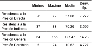 Al evaluar la resistencia a la presión de grupo en el consumo de alcohol, se evidenció que el puntaje promedio a la resistencia a la presión directa fue de 57.08, con una D.T. de 7.2, que según los puntajes teóricos posibles de esta subescala que se ubican entre 18 y 72; este promedio es un puntaje más cercano al puntaje máximo, lo cual significa que en promedio los adolescentes tienden a tener una buena resistencia a la presión directa de grupo. Por otro lado, en la resistencia a la presión indirecta se encontró que los adolescentes tienen una buena resistencia a presión indirecta de grupo. Y en cuanto a la presión percibida, se encontró que los adolescentes en promedio no perciben un nivel alto de presión de grupo (véase tabla 5).