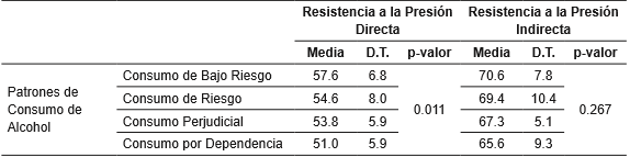 En cuanto a la resistencia a la presión indirecta, no se encontraron diferencias significativas entre los diferentes patrones de consumo de alcohol (p=0.267), lo cual muestra que este factor no influye en los patrones de consumo de alcohol (ver tabla 6).