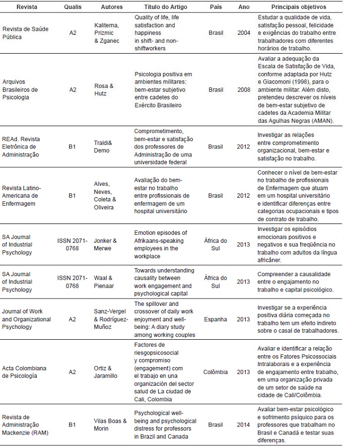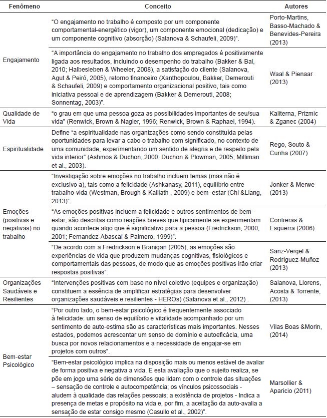 Ao se utilizar o descritor “psicologia positiva”, identificou-se um maior número de artigos nas bases de dados, o que permitiu inferir que o conceito de Psicologia Positiva se caracterizou como tema central nos artigos encontrados, como modo de introduzir pesquisas realizadas sobre diferentes aspectos que envolvem o trabalho, tais como os fenômenos estudados por essa subárea de conhecimento: engajamento (Porto-Martins, Basso-Machado & BenevidesPereira, 2013; Waal & Pienaar, 2013), qualidade de vida (Kaliterna, Prizmic & Zganec, 2004), espiritualidade (Rego, Souto & Cunha, 2007), categorias de bem-estar psicológico, subjetivo e no trabalho (Alves, Neves, Coleta & Oliveira, 2012; Marsollier & Aparício, 2011; Rosa & Hutz, 2008; Santos & Ceballos, 2013; Siqueira & Padovam, 2008; Vilas Boas & Morin, 2014), emoções no trabalho (Contreras & Esguerra, 2006; Jonker & Merwe, 2013; Sanz-Vergel & Rodríguez-Muñoz, 2013), organizações saudáveis e resilientes (Salanova, Llorens, Acosta &Torrente, 2013). Tais temas representam interesse da subárea de conhecimento da psicologia positiva e estão descritos na Tabela 3, apresentada a seguir.