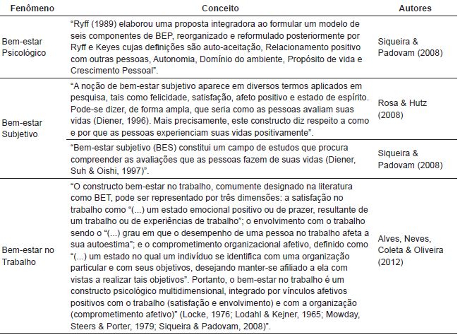 Pode-se observar a partir do tratamento dos artigos selecionados, que para uma maior compreensão do conceito de bem-estar no trabalho, Santos e Ceballos (2013) realizaram revisão de literatura sobre o conceito (BET). Os autores argumentam sobre a crescente importância do bem-estar dos trabalhadores no ambiente físico e psicossocial de trabalho devido às intensas transformações, sobretudo tecnológicas, econômicas, políticas, sociais e culturais que vêm passando. Tal relevância se dá quando a saúde física e psíquica dos trabalhadores é descuidada e como conseqüência acaba por refletir na qualidade de vida, no bem-estar e na felicidade dos trabalhadores. Os autores ainda conjecturam sobre a amplitude deste constructo e as dificuldades encontradas pela indefinição do termo, o que resulta na falta de um instrumento que seja acordado pela maioria.