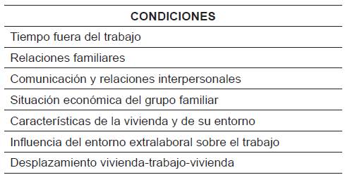 En las condiciones del medioambiente hay que tener en cuenta aspectos como: la exposición al ruido, y físicos como la iluminación, temperatura, agentes contaminantes como el polvo, humo, gases. Todos estos aspectos, relacionados con el medioambiente en la organización, tienen un efecto directo en la salud del trabajador. Con relación a la tarea se consideran aspectos como: la carga física, el horario, las funciones, el nivel de responsabilidad y exigencia. Los aspectos relacionados con la organización hacen referencia a las características que tiene el grupo social de personas, en donde se puede evidenciar el liderazgo ejercido y permitido, la cohesión de grupo, los canales de comunicación formales e informales, la organización del trabajo y el estatus social (Castillo, 1997).