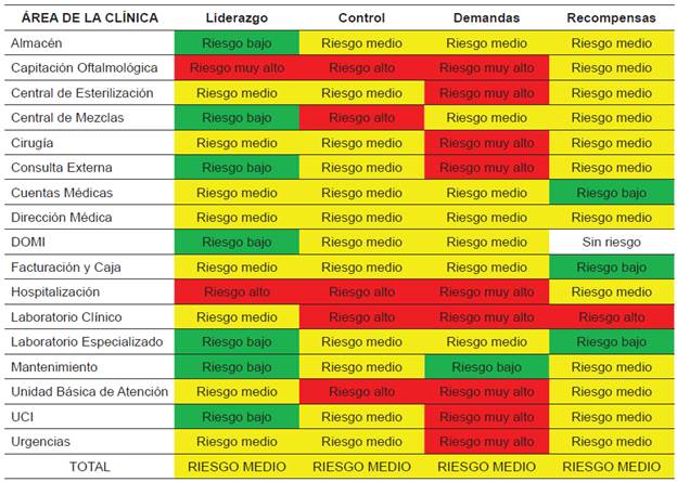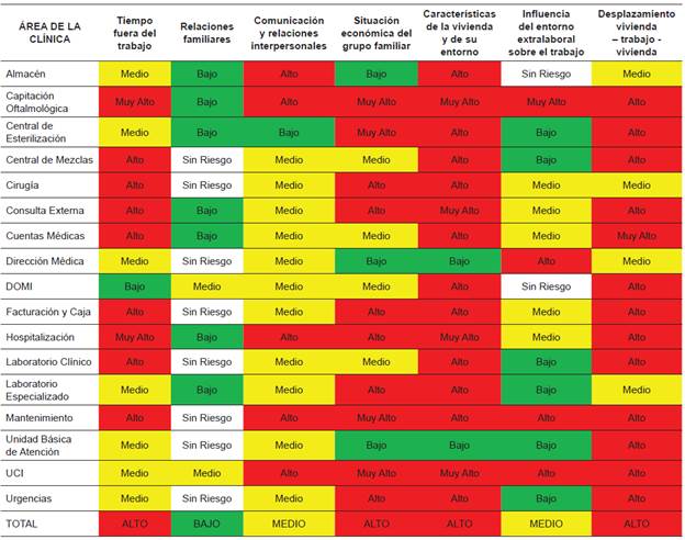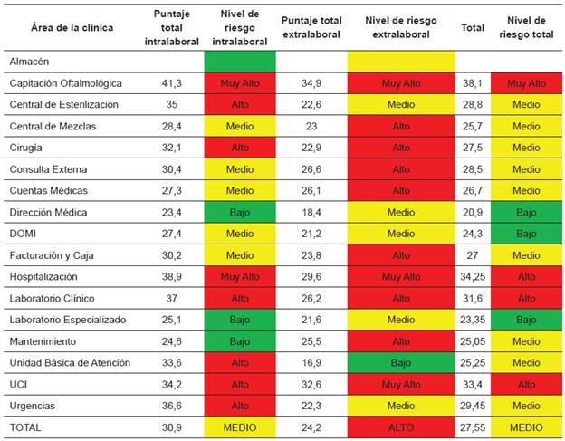 Según la tabla 5, nueve áreas de la clínica están en riesgo alto y muy alto, y el total del puntaje intralaboral de todas las áreas (30,9), según este resultado, indica que el nivel en que se encuentra la clínica es de riesgo alto, ubicado entre los valores 29,6 - 35,4. Diez áreas de la clínica están en riesgo alto y muy alto, y el total del puntaje extralaboral de todas las áreas (24,2), según este resultado, señala que el nivel en que se encuentra la clínica es de riesgo bajo ubicado entre los valores 20,0 - 24,8. El instrumento permite obtener un total de puntaje de riesgo psicosocial intralaboral y extralaboral promediando los dos valores. Se encontró que las áreas de la clínica con mayor riesgo psicosocial son: capitación oftalmológica, en donde tres de los cuatro dominios se encuentran en: demandas del trabajo nivel de riesgo muy alto, control sobre el trabajo se encuentra en nivel alto, y liderazgo y relaciones sociales en el trabajo se encuentran en nivel muy alto. Hospitalización con demandas del trabajo en nivel de riesgo muy alto, control sobre el trabajo en nivel de riesgo alto, liderazgo y relaciones sociales en el trabajo con nivel de riesgo alto. Laboratorio clínico con los dominios recompensa con un nivel de riesgo alto, demandas del trabajo con un nivel de riesgo muy alto, control sobre el trabajo con un nivel alto. UCI con un nivel de riesgo alto en demandas del trabajo.