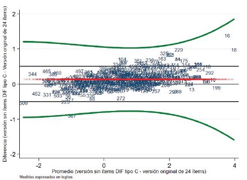 La figura 1 muestra los límites de acuerdo de Bland y Altman para la estimación de la medida de calidad de vida obtenida a partir de la forma sin ítems DIF tipo C (Q3, Q12, Q14, Q15, Q16) y la forma original de 24 ítems. Al tomar como referente la forma sin ítems DIF tipo C, se observa cómo la forma original tiende a subestimar la calidad de vida en los adultos con alta calidad de vida. No obstante, estas diferencias solo son relevantes en una baja proporción de casos, de manera que se ubica la mayoría dentro de los límites de acuerdo (líneas verdes).