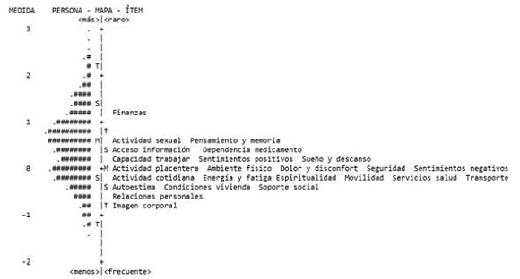 La unidimensionalidad se estableció mediante análisis de componentes principales sobre los contrastes residuales de la medida Rasch. Se consideraron como criterios de unidimensionalidad: 1. Autovalor del primer componente residual <2,0; 2. Varianza explicada por la medida > 40%; y 3. Correlación disatenuada entre los conglomerados del primer componente residual >0,7. La confiabilidad se estimó para los ítems y las personas, y se expresó mediante el índice de separación, el cual indica el número posible de estratos en los que pueden separarse los ítems y las personas (Wright, & Masters, 1982). Se muestra el mapa de Wright para la escala total del WHOQOL-BREF.