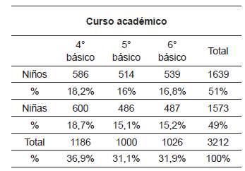 La muestra se reclutó bajo criterio de accesibilidad. La investigación se realizó en 30 centros educativos de educación básica pertenecientes a 10 comunas de la región de Ñuble, en Chile. Se contó con un total de 3212 estudiantes, 1639 niñas y 1573 niños (51 y 49% respectivamente), en edades entre los ocho y los 15 años (M = 10,05, DT = 1,01). La tabla 1 muestra la distribución de la muestra según el sexo y el curso académico.