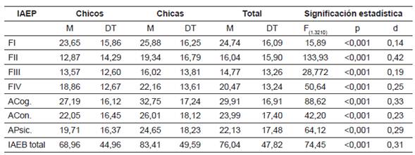Los resultados en función del sexo indican que las niñas presentan puntuaciones más altas en cada una de las variables evaluadas, lo cual demuestra diferencias estadísticamente significativas de pequeña magnitud en todas ellas (véase la tabla 2).