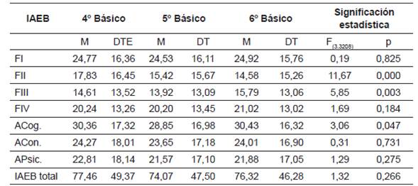 Con respecto al curso académico, se observan diferencias estadísticamente significativas entre 4° y 5°, entre 4° y 6° y entre 5° y 6° año. Estos resultados corroboran los obtenidos en investigaciones previas y alertan sobre su permanencia en el tiempo.