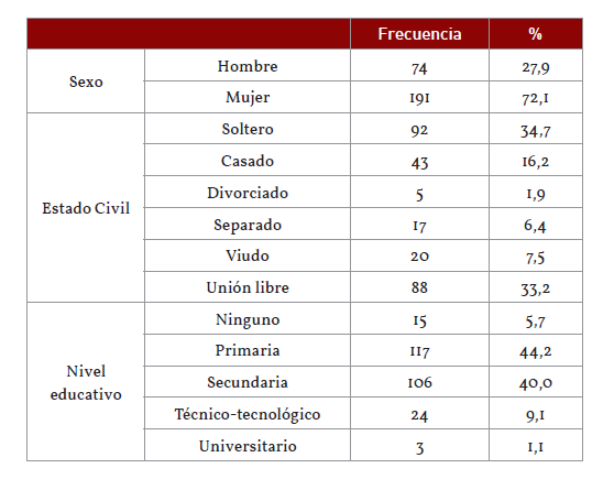 Se seleccionó una muestra no probabilística intencional, constituida por 265 víctimas directas del conflicto armado interno colombiano de la Unidad de Atención y Orientación (UAO) del municipio de Soacha. El rango de edad fue de 18 a 60 años y del total de participantes 191 (72,1 %) fueron mujeres y 74 (27,9 %) hombres. Estos datos se resumen en la tabla 1.