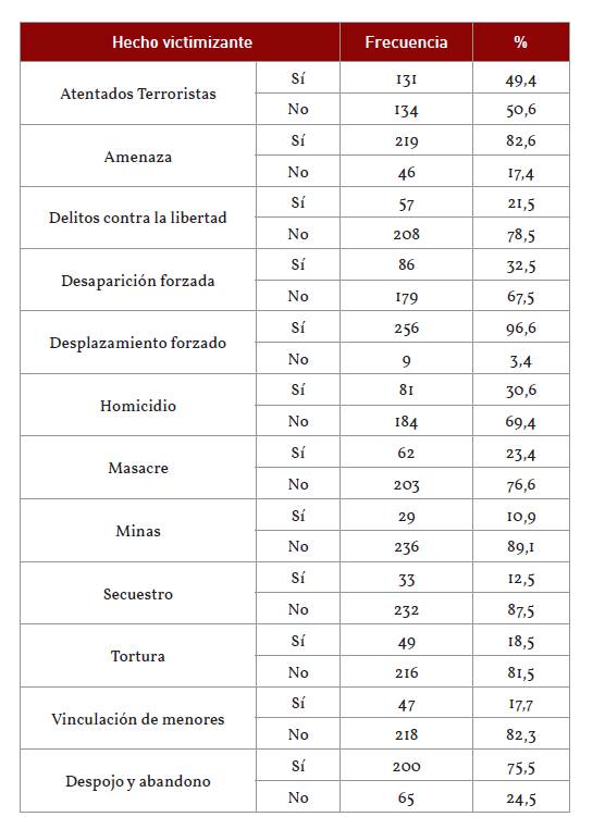 A continuación, en la tabla 2, se presentan las frecuencias y los porcentajes relacionados con los hechos victimizantes presentes en la población objeto del estudio. El 49,4 % afirman haber sido víctimas de atentados terroristas; el 82,6 %, de amenazas; el 21,5 %, de delitos contra la libertad; y el 32,5 %, de desaparición forzada. Por su parte, el 96,6 %, que equivale a 256 sujetos, han manifestado haber sido víctimas de desplazamiento forzado; un 30,6 %, de homicidio; un 23,4 %, de masacres; y un 10,9 %, de minas; el 12,5 %, de secuestro; un 18,5 %, de torturas; el 17,7 %, de vinculación de menores al conflicto. Finalmente, y el 75,5 %, que equivale a 200 sujetos, han manifestado haber sido víctimas de despojo.