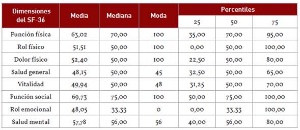 En relación con las puntuaciones en las dimensiones del cuestionario de salud SF-36, en el análisis de medias se pudo identificar que (tabla 3) las puntuaciones más bajas se encuentran en vitalidad con un 49,94 %, en salud general con un 48,15 % y en rol emocional con un 48,05 %, de modo que son las puntuaciones más altas las relacionadas con función social con un 69,73 %, función física con un 63,02 % y salud mental con un 57,78 %. El análisis de percentiles muestra que el rol emocional, el rol físico, la vitalidad, la salud general y la función física presentan menores puntuaciones en los primeros 25 puntos en una escala de 3 medidas.