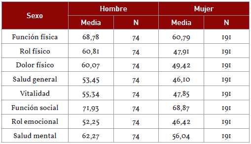 Al realizar un análisis de media por sexo (tabla 4), se evidencian diferencias entre hombres y mujeres, de modo que son los más significativos los relacionados con el rol físico, el dolor físico y la salud mental. En general, las mujeres presentan menores puntuaciones en las 8 dimensiones del cuestionario.