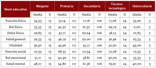 El nivel de estudios de las víctimas participantes varía desde no tener ninguno hasta estudios profesionales. Las víctimas sin ningún nivel de formación reportaron bajos niveles de calidad de vida en salud en comparación con los demás. Es importante realizar un análisis detallado de las víctimas con nivel de formación profesional, puesto que se perciben muy bien en función social y en vitalidad, pero no muy bien en salud mental, función física, rol físico y dolor físico. Es necesario ampliar la muestra de víctimas profesionales para poder profundizar en su estado y percepción en calidad de vida en salud.