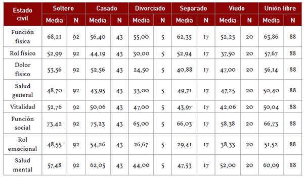 En relación con el análisis por estado civil (tabla 6), los casados presentan la media más alta en función social con un 75,23 % y los divorciados las más bajas en rol físico con un 30 %, mientras que el dolor físico presenta un 24,50 %, la salud general un 33 %, y el rol emocional un 26,67 %.
