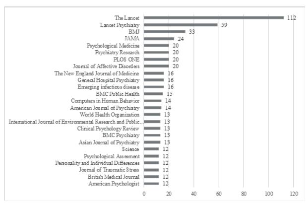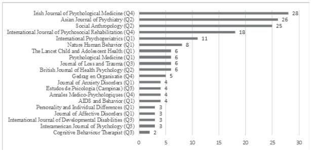Figure 1 shows the 20 journals where most articles have published according to this review during the pandemic. The Irish Journal of Psychological Medicine published 28 articles related to COVID-19. Next to the title in parentheses is the quartile of each journal based on the 2019 SCOPUS ranking (https://www.sdma-gojr.com/).