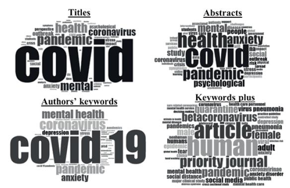 As a result, we merge the analysis of the four mentioned characteristics to have a better understanding of the downloaded documents (Figure 4). The size of the words indicates the frequency of occurrences in the articles consulted. For instance, in the titles, the word “COVID” was the one that had the most appearances in 181 papers, in the abstracts the word “COVID” had 340 appearances, and so on. We noticed that the algorithm of the plus keywords categorized several of these articles as “priority journal” and most of the words are related to the impact of the pandemic on mental health.