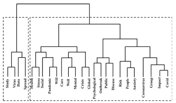 Besides, we performed a text mining factor analysis of the words in the abstracts using multiple correspondence analysis methods to explore the concep tual structure of the published documents. This mapping strategy displays the structural and dynamic aspects of scientific research. Figure 5 shows the two factors. The first of them represents related articles that allude to COVID-19 and the reporting of disease data. The second factor represents studies related to the psychological effects of COVID-19 pandemic.