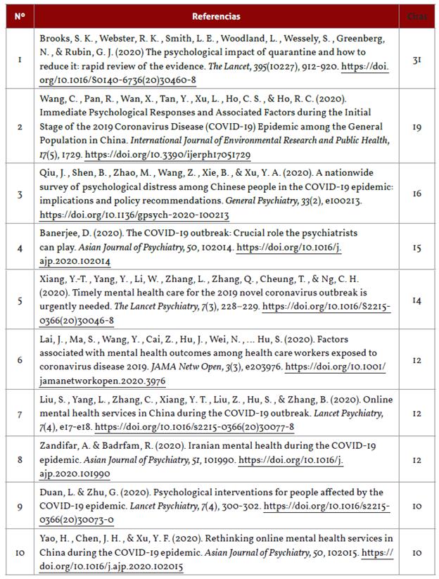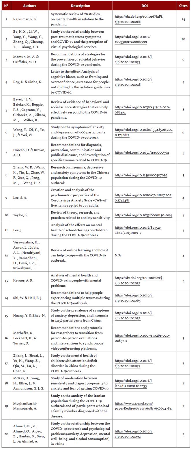 Additionally, we examined the frequency of citation of the articles until June 12, 2020. Table 1 shows the first 20 articles with the highest citation with their respective DOI number and a brief description of the articles. These articles focus on the effects of COVID-19 on mental health and most of them were made in China.