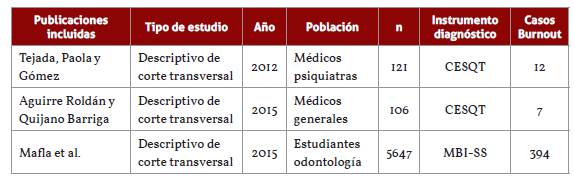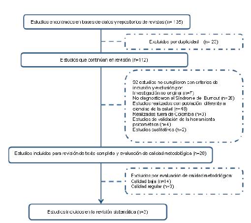 Como criterios de inclusión se tuvieron en cuenta estudios de investigación original realizados en Colombia con estudiantes o trabajadores de ciencias de la salud, que fueran de tipo cuantitativo descriptivo o analítico, publicados durante el periodo de revisión, que diagnosticaron el síndrome de burnout con instrumentos validados. Se excluyeron estudios cuyo objetivo principal fue validar la herramienta psicométrica para el diagnóstico del síndrome de burnout, estudios de tipo cualitativo o series de casos y artículos que no tuvieron en cuenta la definición de caso establecida para el síndrome, que en este caso correspondía a: niveles altos en las dimensiones de agotamiento emocional y despersonalización, niveles bajos en la dimensión realización personal.