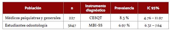 Esta revisión da cuenta de los trabajos de investigación del síndrome de burnout en Colombia en trabajadores y estudiantes de la salud. La prevalencia global de burnout en médicos en Colombia fue del 8.3 %, siendo esta mayor en la población de médicos generales y psiquiatras comparada con la de estudiantes de odontología.
