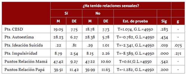 Atendiendo el segundo objetivo de este trabajo, los puntajes promedio de cada escala se compararon entre los grupos definidos por las respuestas a cada pregunta del cuestionario de Conductas Sexuales. En la tabla 1 se presentan las comparaciones de medias entre los puntajes de las escalas aplicadas y la pregunta 1. "¿Ha tenido relaciones sexuales?". En esta pregunta solo existen diferencias significativas para Ideación Suicida y para Impulsividad. En el caso de la Ideación Suicida, los puntajes son significativamente mayores en quienes no han tenido relaciones sexuales, mientras que para la escala de Impulsividad los promedios son mayores en quienes ya han tenido relaciones sexuales. No obstante, en ambos casos el tamaño del efecto es pequeño.