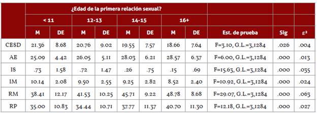 En lo que se refiere a la escala de Autoestima, el grupo diferenciado es el que inició su vida sexual a los 11 años o menos, reportando un promedio de Autoestima significativamente menor respecto a los otros grupos de edad. Por su parte, la Ideación Suicida reportó promedios significativamente superiores en los grupos de edad más bajos, lo que sugiere que esta problemática aumenta cuando la iniciación de la vida sexual se realiza a una corta edad. En cuanto a la Relación con Mamá y la Relación con Papá, los puntajes más altos corresponden al grupo que inició su vida sexual a los 16 años o más, lo que posiblemente se explica a partir de mejor comunicación, supervisión y muestras de afecto por parte de los padres hacia los adolescentes (tabla 2). Sin embargo, observando los valores bajos de £2, es claro que los puntajes de las escalas variaron muy poco como efecto del grupo de edad.