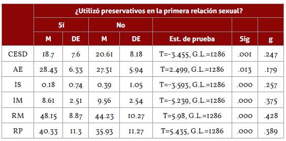 En relación con la pregunta 3, "¿Utilizó preservativos en la primera relación sexual?", existen diferencias significativas para todas las escalas aplicadas. Respecto a la escala CES-D, los puntajes promedio son mayores en quienes declararon no haber utilizado preservativo en el primer acto sexual. En cuanto a la autoestima, los puntajes más altos lo reportan quienes sí utilizaron condón durante su iniciación sexual. En consonancia, con estos resultados, el promedio de los puntajes de la Ideación es más alto en aquellos que declararon no haber utilizado condón en su primera experiencia sexual.