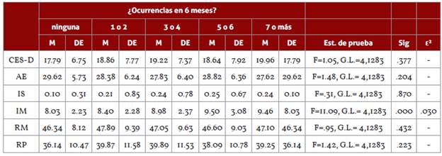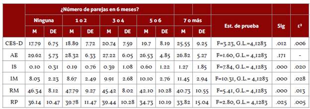 La pregunta 5, "¿Cuántas parejas diferentes has tenido en los últimos 6 meses?", muestra diferencias significativas para la mayoría de las escalas, excepto para Autoestima. Para la escala CES-D, el grupo diferenciado es el de 7 o más parejas, el cual obtuvo el puntaje promedio más alto. Este grupo también fue el grupo diferenciado para las otras escalas evaluadas. En este sentido, la Ideación Suicida y la Impulsividad tienen promedios más altos en ese mismo grupo. En el caso de la Relación con Mamá y la Relación con Papá, el grupo de jóvenes que declararon haber tenido 7 o más parejas en los últimos 6 meses promedio los puntajes más bajos, lo que sugiere que esta conducta de riesgo puede presentarse con mayor notoriedad cuando los padres no dan acompañamiento u orientación a sus hijos (tabla 5). Para todas las escalas medidas, el tamaño del efecto del número de parejas es próximo a cero.