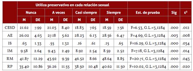 Para la pregunta 6, "¿Utiliza preservativo en cada relación sexual?", se halló diferencias significativas (p<.05) para todas las escalas aplicadas. Para la mayoría de ellas, excepto para la Escala de Autoestima, el grupo diferenciado identificado fue el que respondió Nunca. Es decir, quienes señalaron no utilizar Nunca condón en cada relación sexual obtuvieron los puntajes promedio más altos para la escala CES-D, Ideación Suicida e Impulsividad, así como lo puntajes promedios más bajos en cuanto a la escala de Relación Mamá y Relación Papá. Para la Escala de Autoestima, los puntajes promedio más altos correspondieron al grupo de participantes que Siempre utiliza preservativo en cada encuentro sexual (tabla 6). El tamaño del efecto para todas las comparaciones es pequeño.